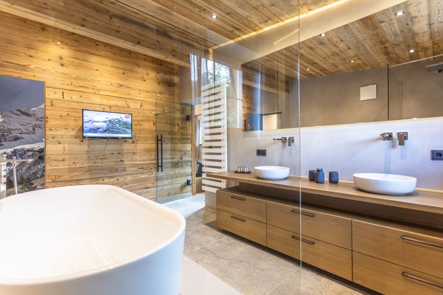 - Badezimmer mit Dusche und Badewanne, Doppelwaschtisch und Föhn